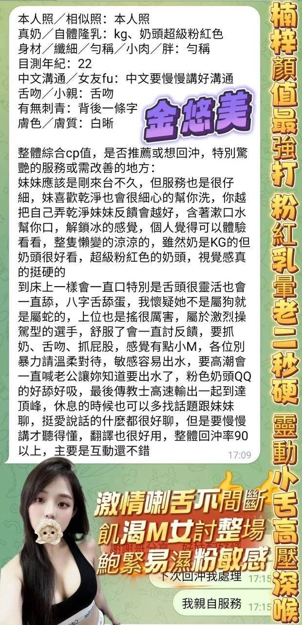 可配合 :奶砲,按摩,69,陪洗,共浴,LG(舌吻)依氣氛衛生而定,可親嘴,無套吹,足交,品鮑,舔蛋,冰火,顏射,深喉嚨,玩具(按摩棒),玩具(跳蛋),自慰秀,快餐,2S