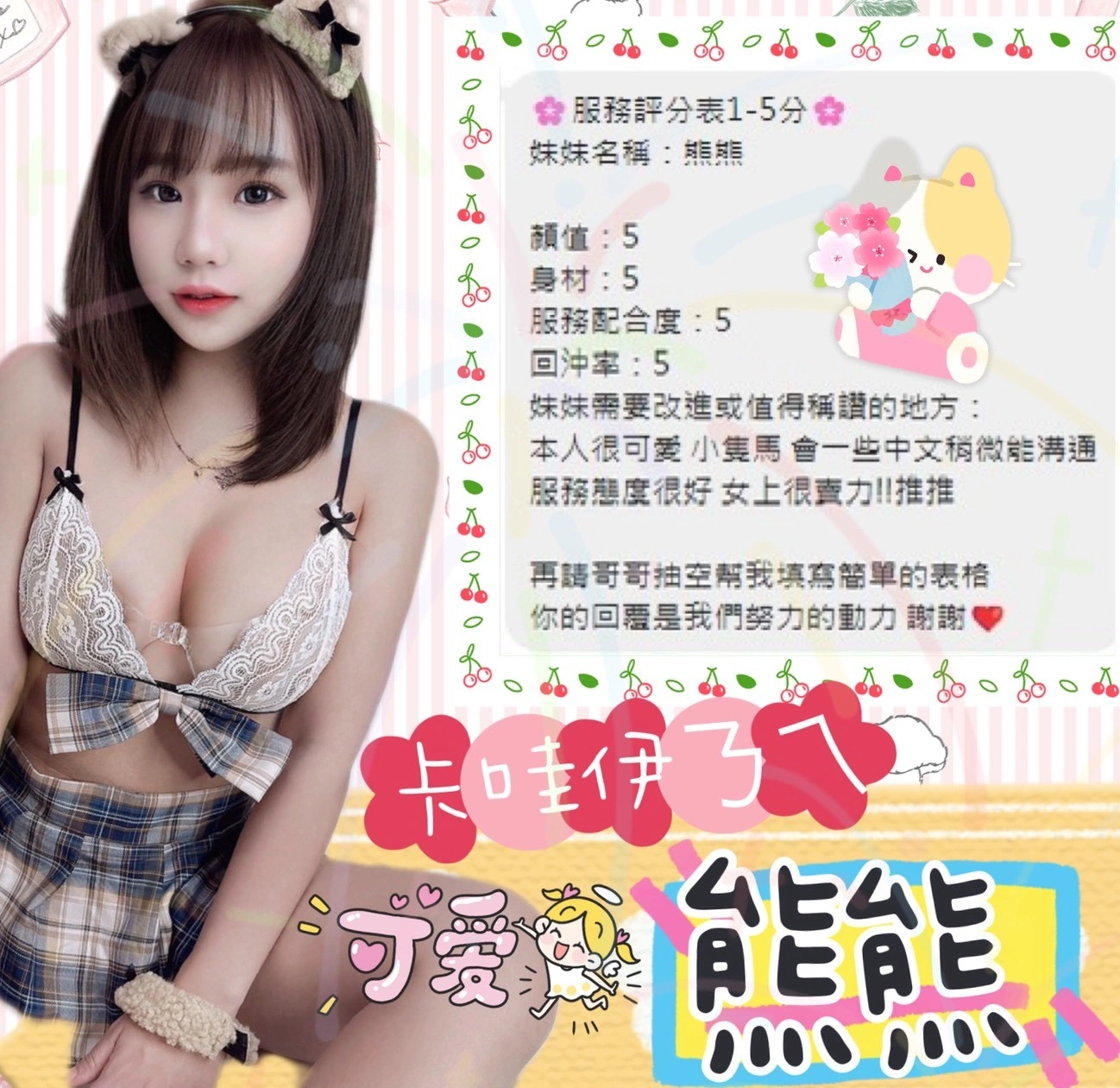 可配合 :按摩,69,共浴,泰國浴,LG(舌吻)依氣氛衛生而定,可親嘴,無套吹,口爆,品鮑,舔蛋,冰火,絲襪(自備免付),玩具(按摩棒),玩具(跳蛋),情趣用品(客自備),中文溝通,快餐,2S