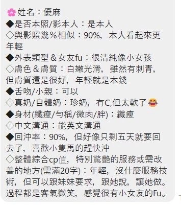 可配合 :奶砲,按摩,69,共浴,LG(舌吻)依氣氛衛生而定,可親嘴,無套吹,口爆,足交,潮吹(依貴賓技術而定),品鮑,舔蛋,奶推,屁推,顏射,深喉嚨,變裝(自備免付),絲襪(自備免付),玩具(按摩棒),玩具(跳蛋),情趣用品(客自備),白人,中文溝通,英文溝通,快餐,2S,NS,包夜,射後清槍