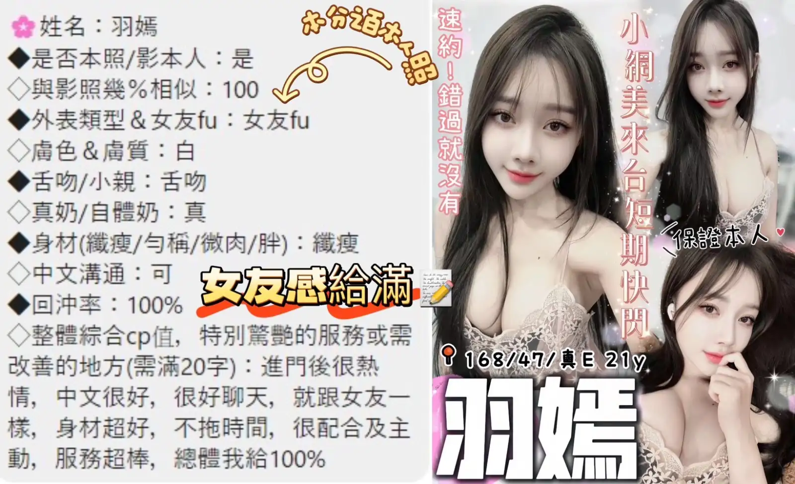 答:不可以哦,因為妹妹都是兼職的,在我們這般約她我們能保證在第一時間保護雙方的安全。如果加聯絡方式自己約,出現任何經濟糾紛與我們無關(有真實案例),請重視!!!