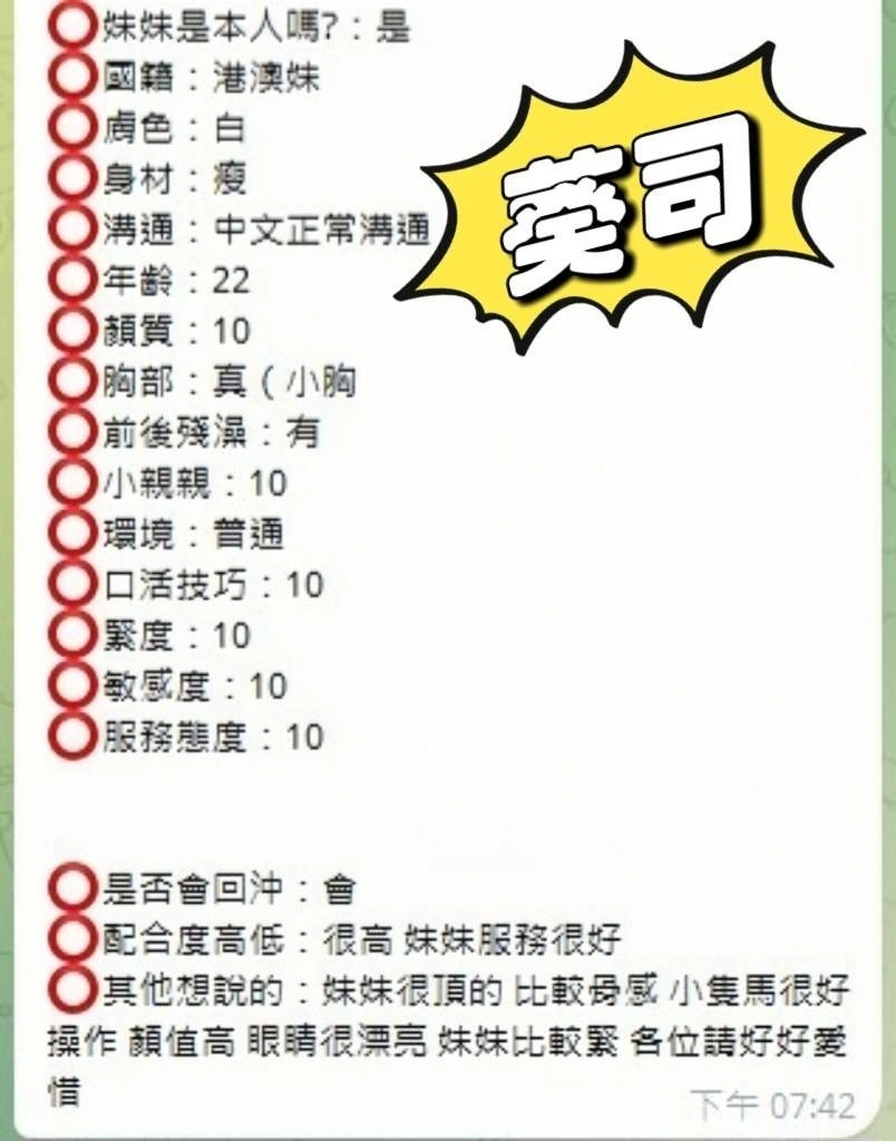 可配合 :按摩,69,陪洗,殘廢澡,LG(舌吻)依氣氛衛生而定,可親嘴,無套吹,品鮑,舔蛋,輕功,漫遊,奶推,浴中蕭,變裝,變裝(自備免付),絲襪(自備免付),情趣用品(客自備)
