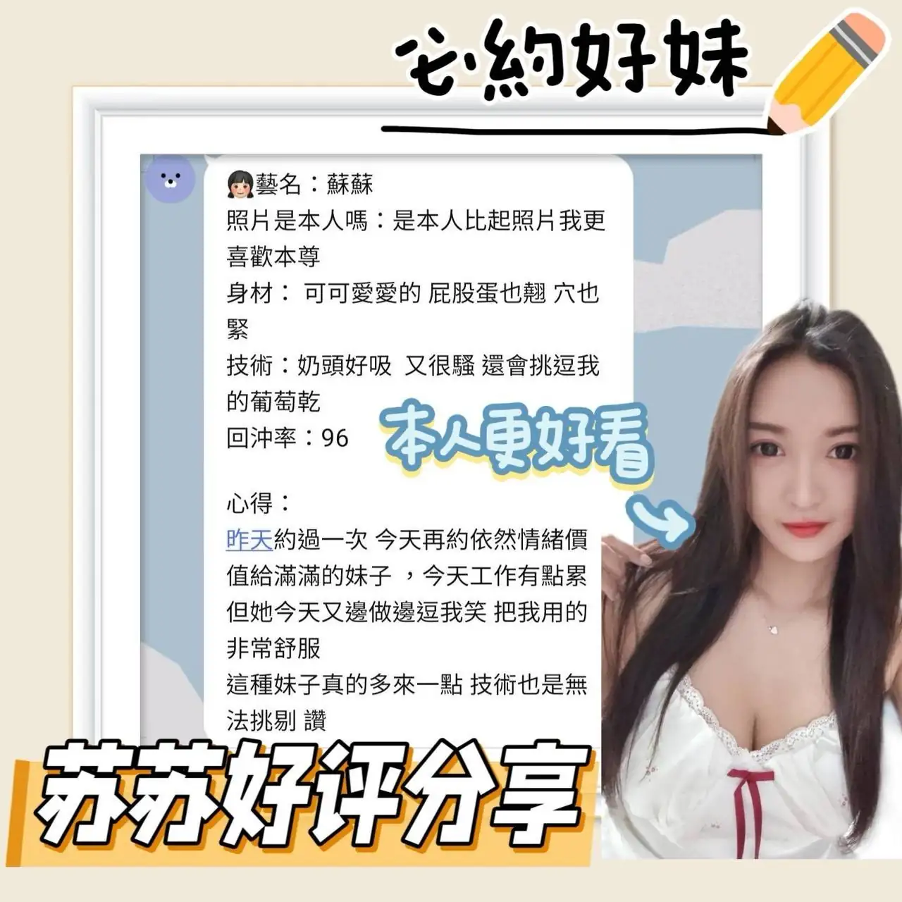 答:不可以哦,因為妹妹都是兼職的,在我們這般約她我們能保證在第一時間保護雙方的安全。如果加聯絡方式自己約,出現任何經濟糾紛與我們無關(有真實案例),請重視!!!