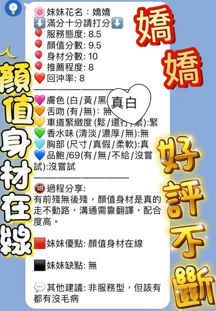 答:不可以哦,因為妹妹都是兼職的,在我們這般約她我們能保證在第一時間保護雙方的安全。如果加聯絡方式自己約,出現任何經濟糾紛與我們無關(有真實案例),請重視!!!