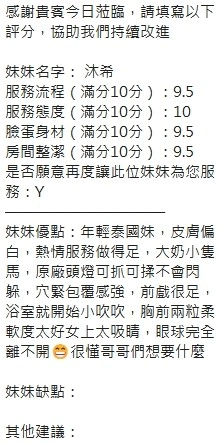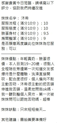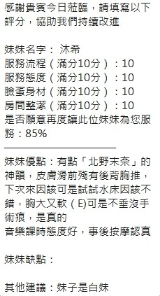 可配合 :奶砲,按摩,69,共浴,LG(舌吻)依氣氛衛生而定,可親嘴,無套吹,口爆,品鮑,舔蛋,奶推,屁推,水床浴,變裝(自備免付),絲襪(自備免付),快餐