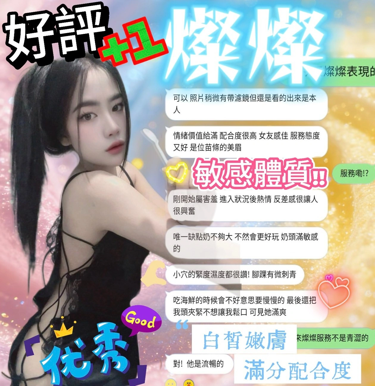 可配合 :按摩,69,共浴,LG(舌吻)依氣氛衛生而定,可親嘴,無套吹,口爆,足交,品鮑,舔蛋,浴中蕭,絲襪,玩具(按摩棒),玩具(跳蛋),自慰秀,快餐,2S