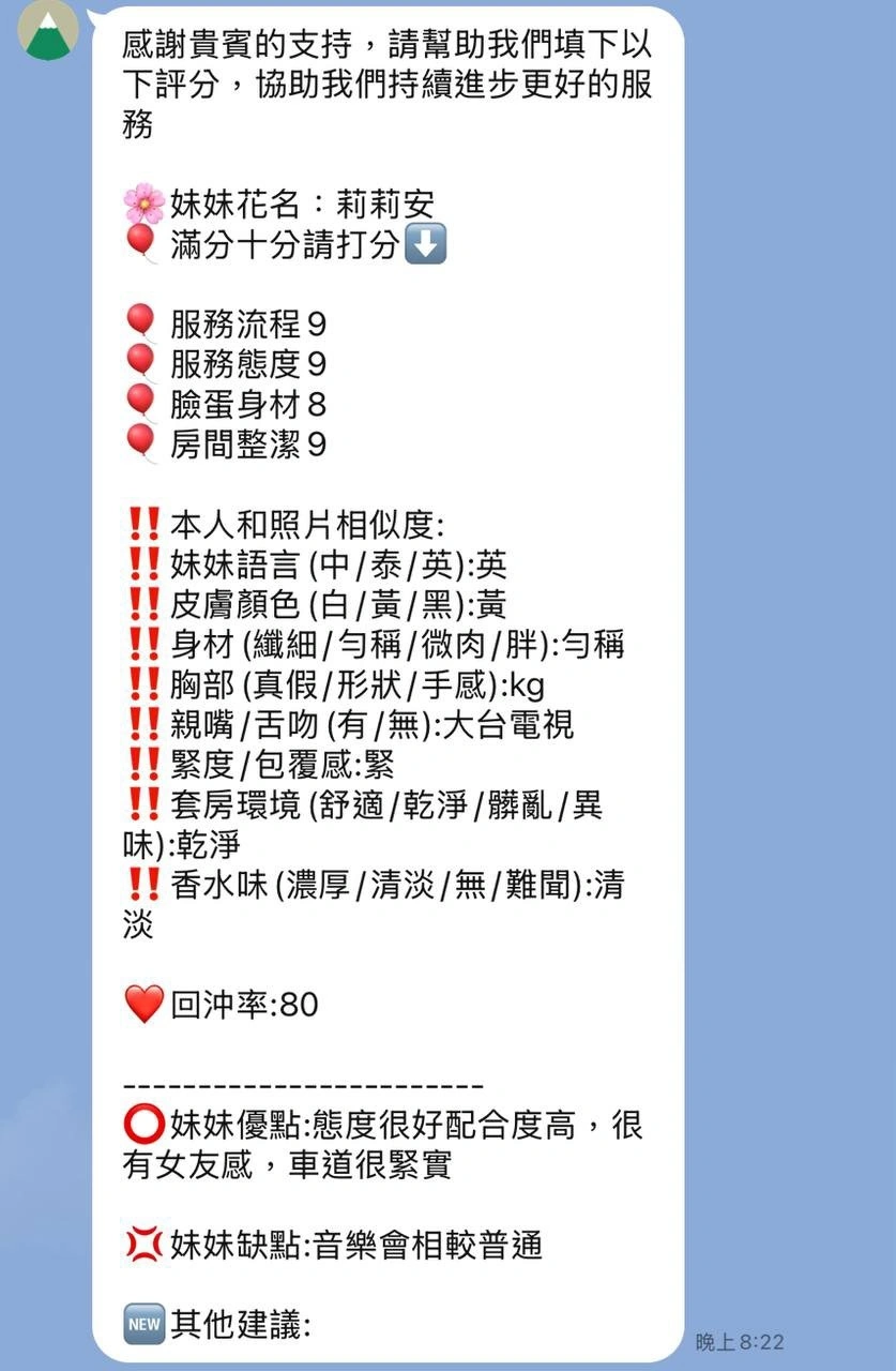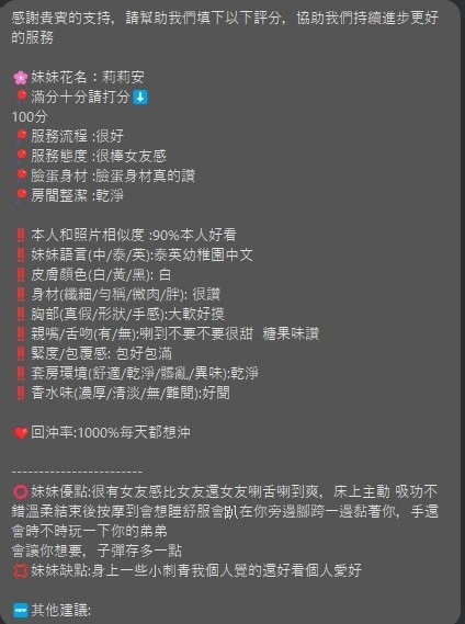 可配合 :奶砲,按摩,69,LG(舌吻)依氣氛衛生而定,可親嘴,口爆,品鮑,舔蛋,奶推,屁推,冰火,顏射,變裝(自備免付),絲襪(自備免付),自慰秀,英文溝通,快餐,2S