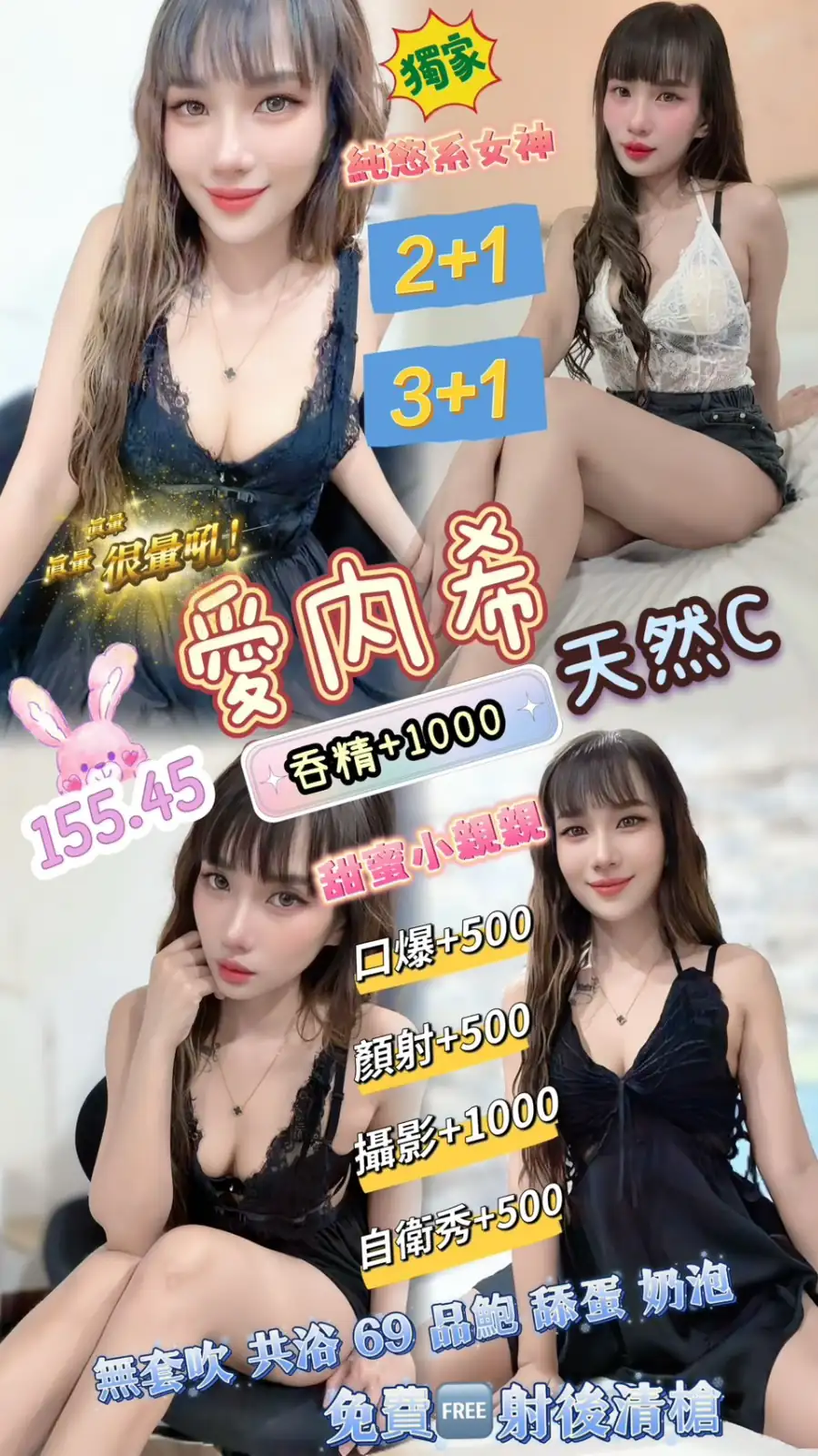 可配合 : 奶砲,按摩,69,可親嘴,無套吹,口爆,吞精,品鮑,舔蛋,奶推,屁推,顏射,自慰秀,攝影,快餐,2S,射後清槍