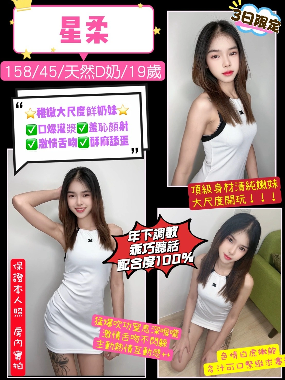 加價項目 : 2S+600(60分),顏射+500,口爆+500,絲襪+100,無套外射+1000