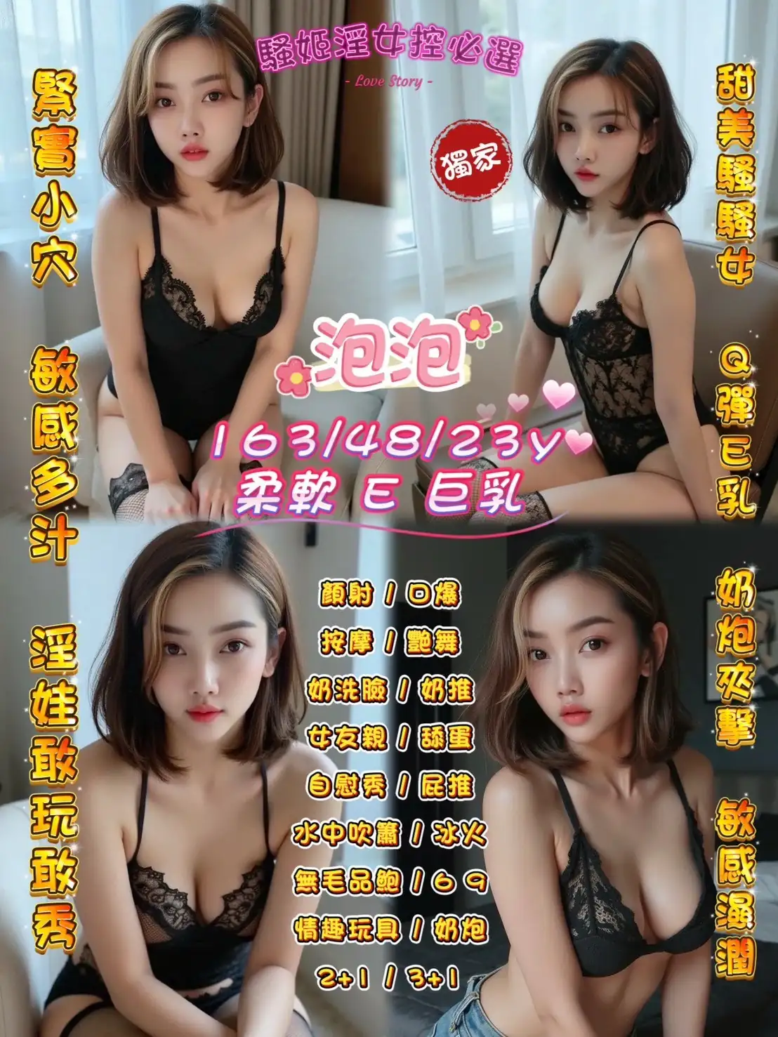 可配合 :奶砲,按摩,69,可親嘴,口爆,品鮑,舔蛋,奶推,屁推,冰火,顏射,浴中蕭,艷舞秀,變裝,絲襪,玩具(按摩棒),玩具(跳蛋),情趣用品(客自備),自慰秀,快餐,2S