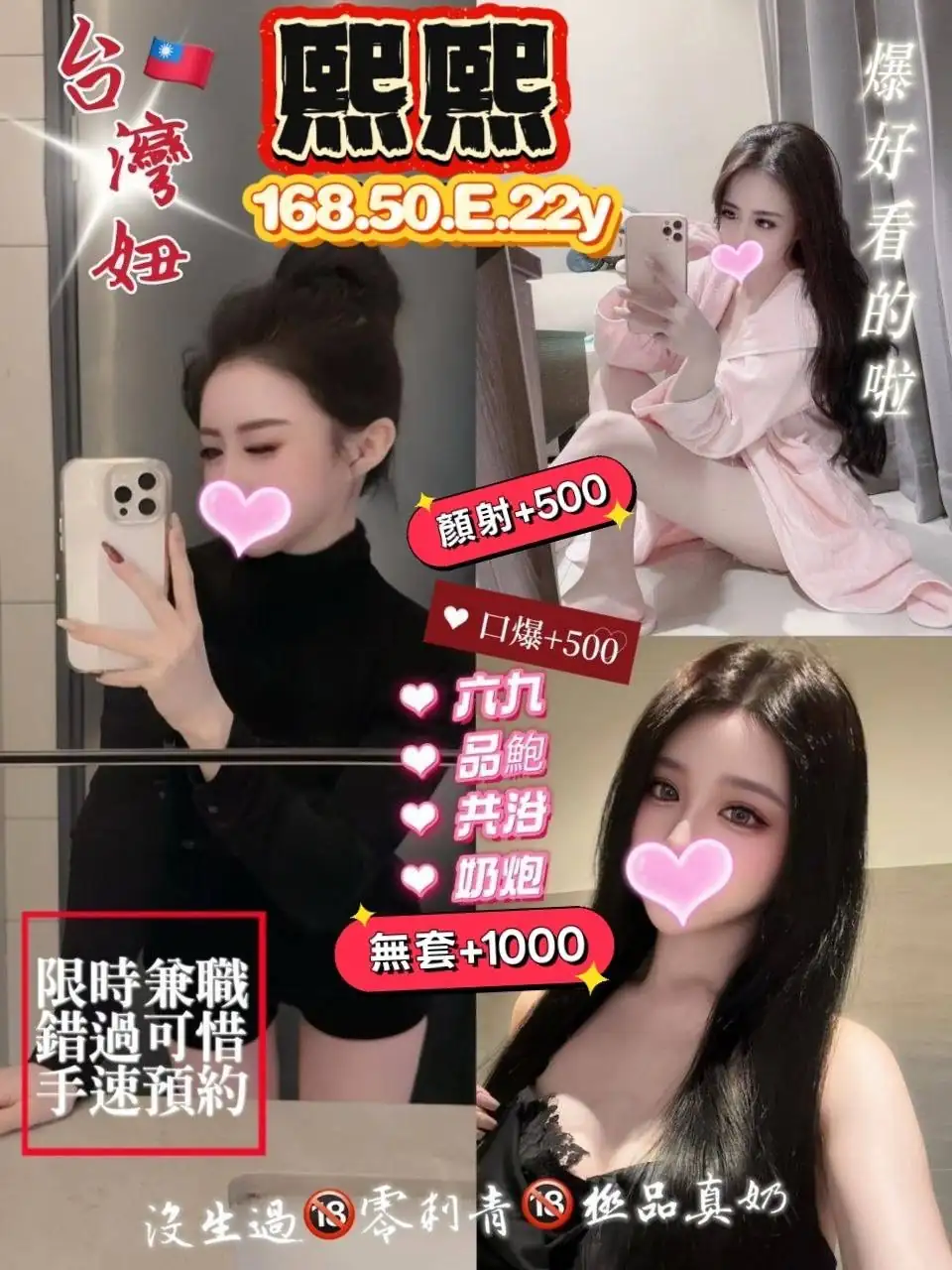 加價項目 : 2S+500(60分),口爆+500,顏射+500,無套外射+1000