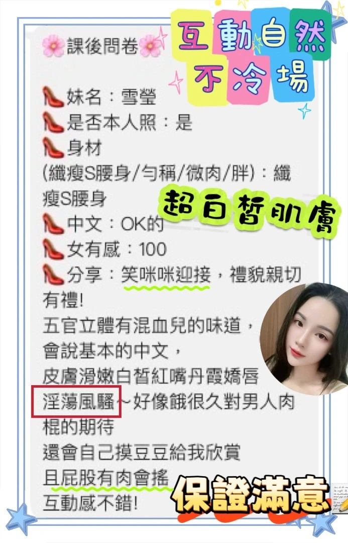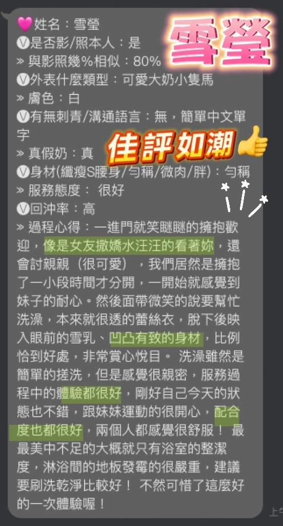 可配合 :奶砲,按摩,69,共浴,LG(舌吻)依氣氛衛生而定,可親嘴,無套吹,口爆,品鮑,舔蛋,奶推,冰火,顏射,深喉嚨,絲襪,玩具(按摩棒),玩具(跳蛋),情趣用品(客自備),中文溝通,快餐,2S