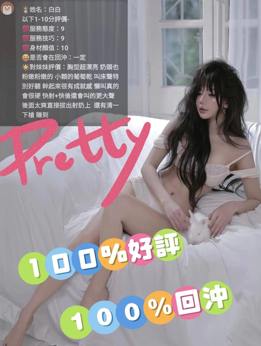 可配合 :按摩,69,共浴,LG(舌吻)依氣氛衛生而定,可親嘴,無套吹,品鮑,無套做,快餐,2S